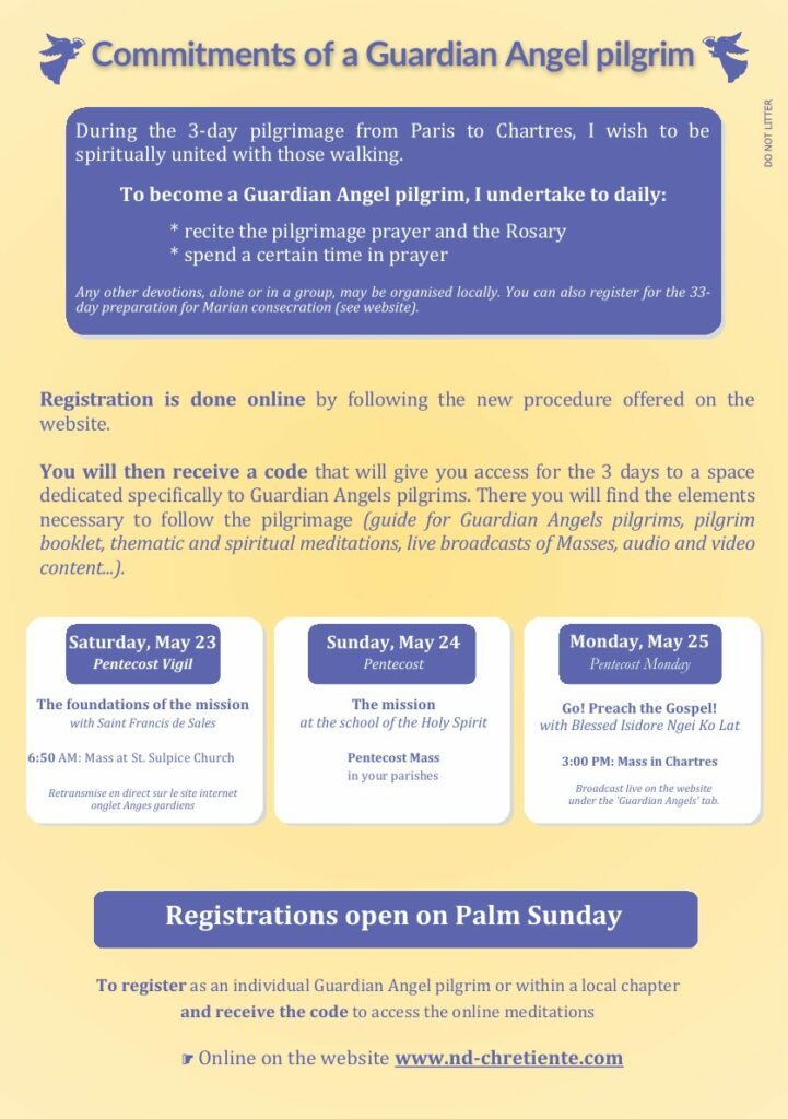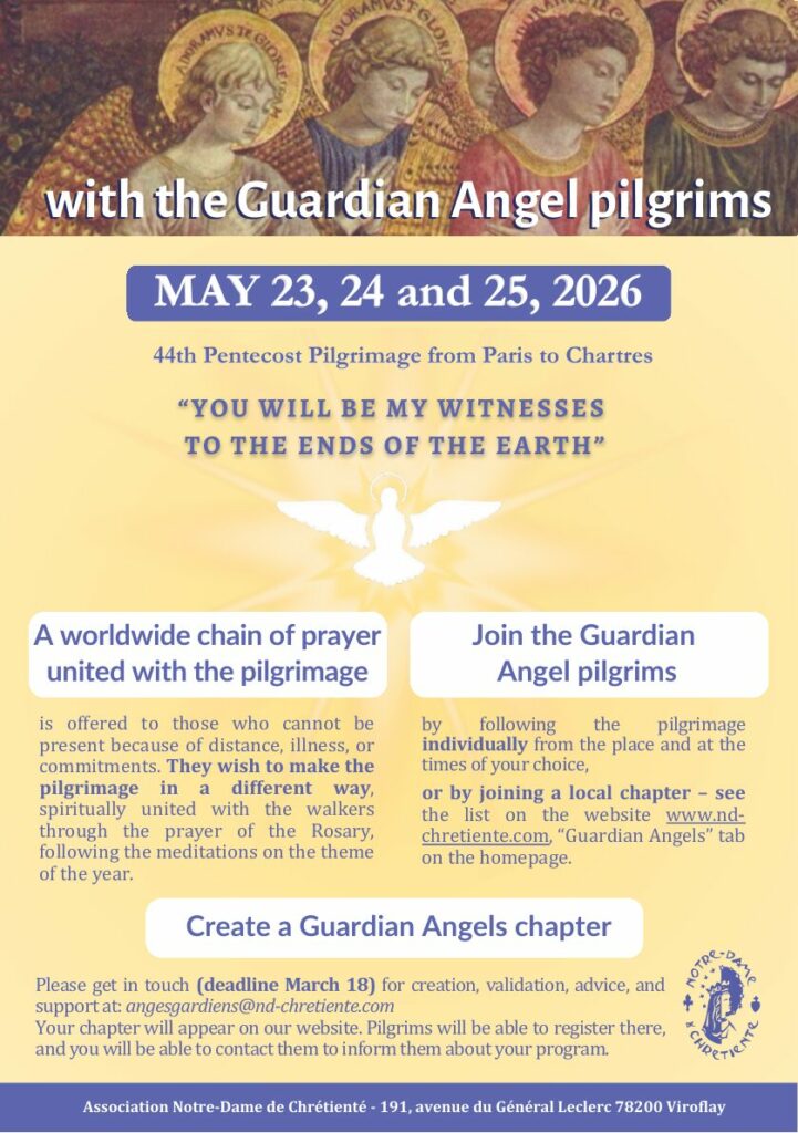 In the communion of saints, through the Marian prayer of the rosary, they pray for the great intentions of the Church, call for the restoration of the reign of Christ the King over the Nations, and reciprocally carry the intentions of the pilgrimage and their own, which will be deposited on Whit Monday at the feet of Our Lady of the Pillar in Chartres Cathedral.