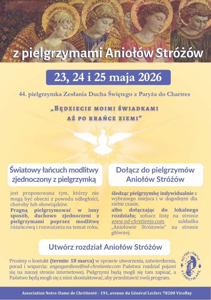 W komunii świętych, poprzez modlitwę maryjną różańcem, modlą się za wielkie intencje Kościoła, wzywają do przywrócenia panowania Chrystusa-Króla nad narodami i nawzajem niosą intencje pielgrzymki oraz własne, które zostaną złożone w poniedziałek Zielonych Świąt u stóp Matki Bożej Pilarnej w katedrze w Chartres.